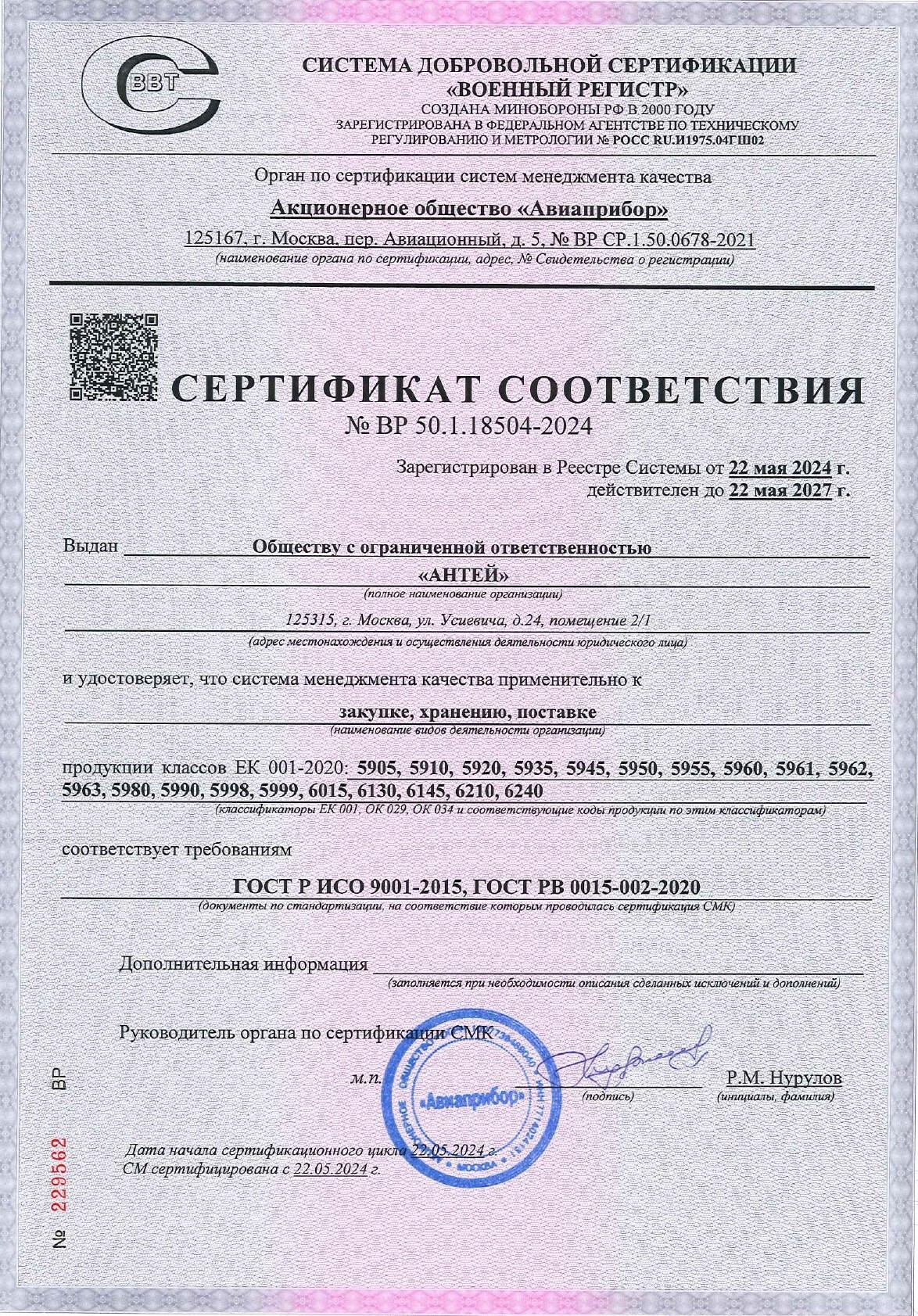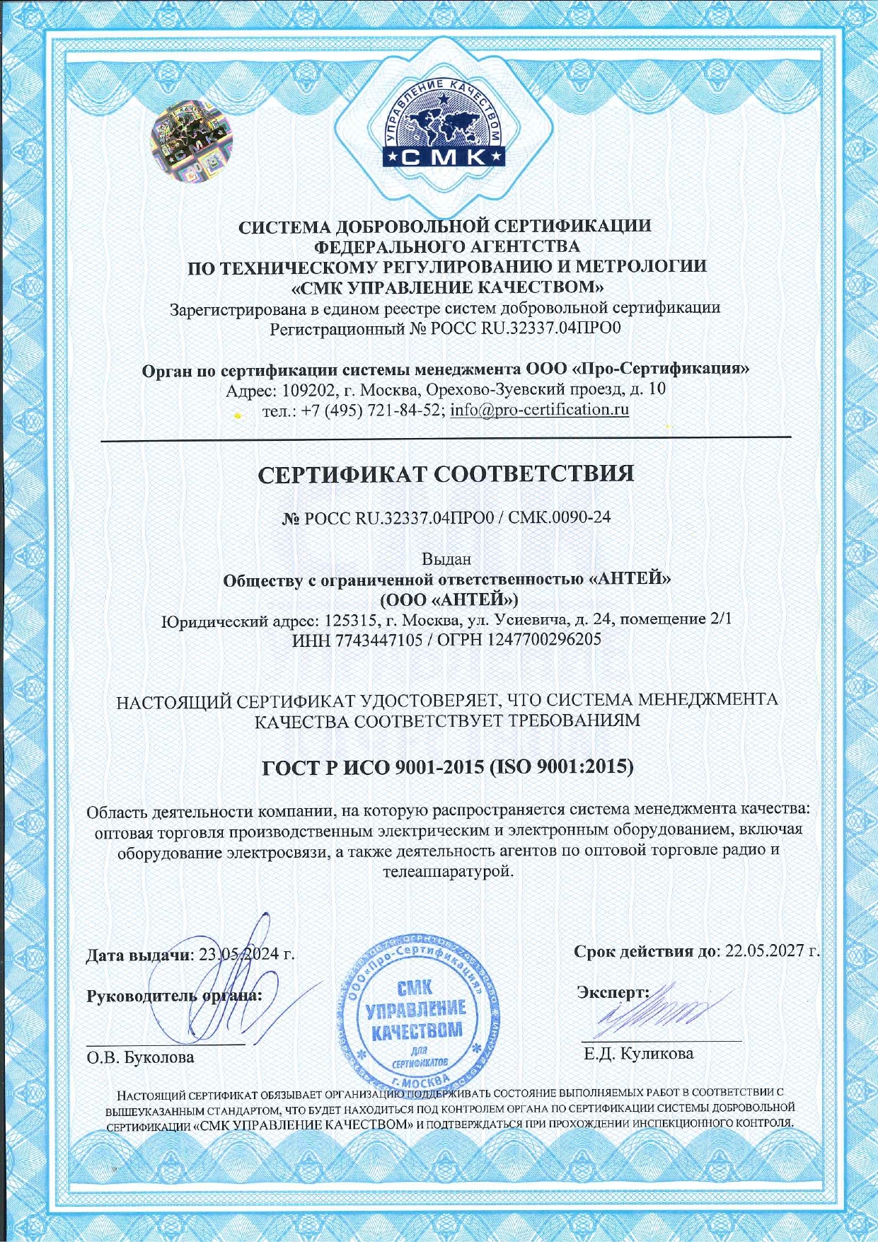 В Компании ООО "АНТЕЙ" внедрена и результативно функционирует система менеджмента качества (СМК), в настоящее время соответствующая требованиям